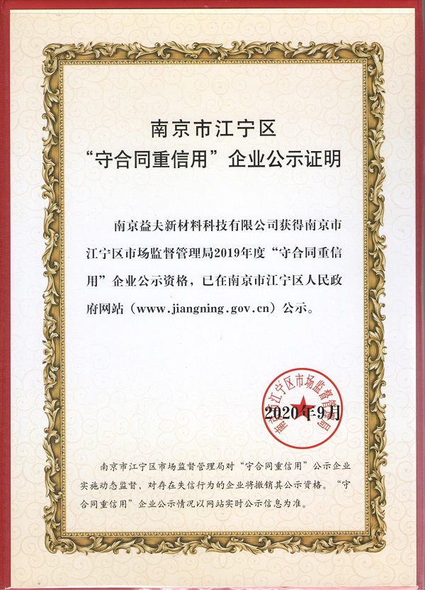 2020年9月我司榮獲南京市江寧區(qū)“守合同重信用”企業(yè)稱號(hào),這也是符合我司經(jīng)營(yíng)理念的,我司一再堅(jiān)持,任何銷售形式都要以有合同為前提,嚴(yán)格按照合同內(nèi)容規(guī)范執(zhí)行。合同,是受國(guó)家商法規(guī)范的可執(zhí)行法律。信用,是社會(huì)良知的基礎(chǔ)。是現(xiàn)代發(fā)達(dá)國(guó)家一切的人類人民人們生活的所有基點(diǎn)和基礎(chǔ)。南京益夫會(huì)堅(jiān)持守合同重信用,為建材行業(yè)交易市場(chǎng)的有序健康發(fā)展沖鋒打頭陣。