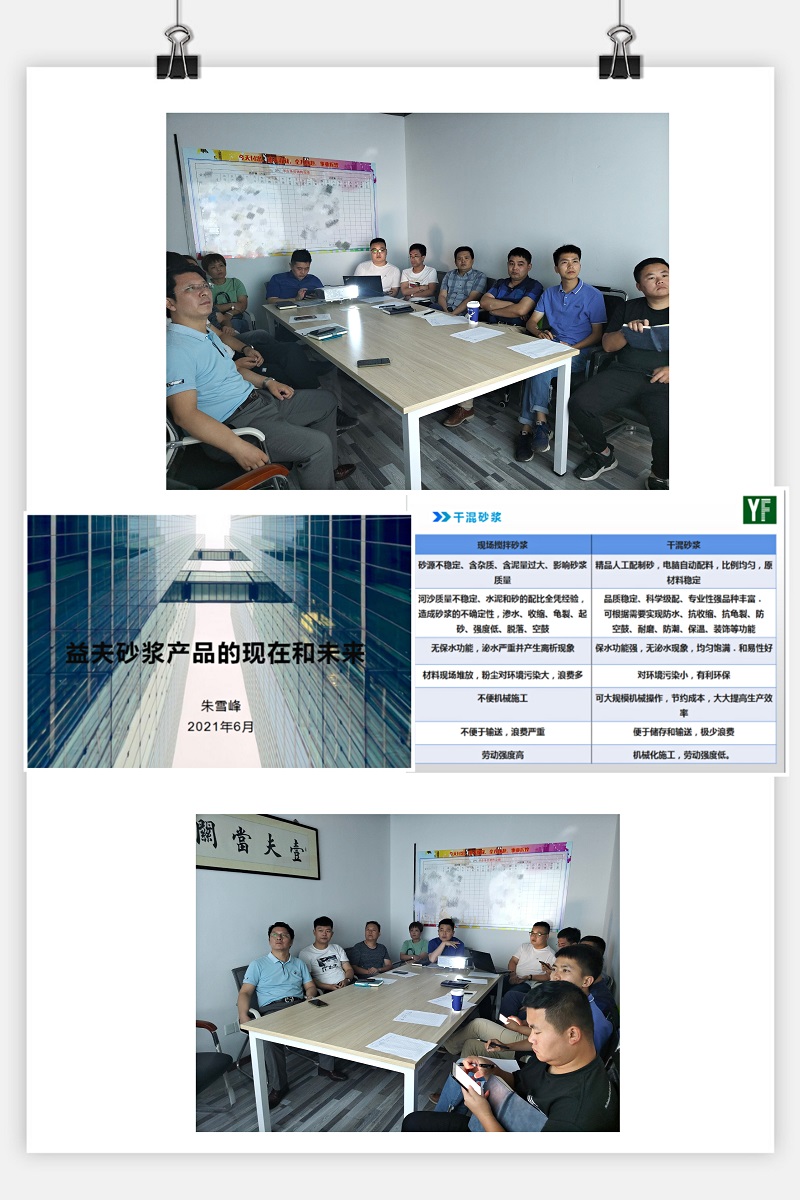 7月14日下午銷售部每周例會結束后,又請實驗室朱主任為銷售部進行產品知識培訓。此次朱主任特意準備了35頁的精美PPT,培訓主題是“益夫砂漿產品的現在和未來”,內容包括對公司現有產品的成分、性能、施工工藝、產品之間優(yōu)劣勢對比、現場常見產品問題的展示并給出解決方案、對市面上新型產品進行分析、對公司未來的產品發(fā)展指出方向。PPT內容附上現場圖片和施工視頻,圖文結合,直觀易懂。從2020年起,砂漿的規(guī)格型號就發(fā)生了改變,朱主任在培訓時針對型號的變化做出解釋,這方便業(yè)務員日后與工地進行說明。培訓結束后,大家熱烈鼓掌,對朱主任細致全面的培訓表示感謝,并表示此類培訓以后能夠多多開展。